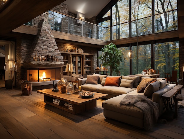 - Просторная гостиная с панорамными окнами и камином