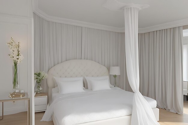 Если вам нравится идея сохранить спокойную атмосферу в спальне, можно выбрать монохромные теневые шторы, которые будут гармонировать с белыми обоями. Например, нежно-серый оттенок будет идеально сочетаться с белыми стенами, создавая элегантное и приятное визуальное впечатление.